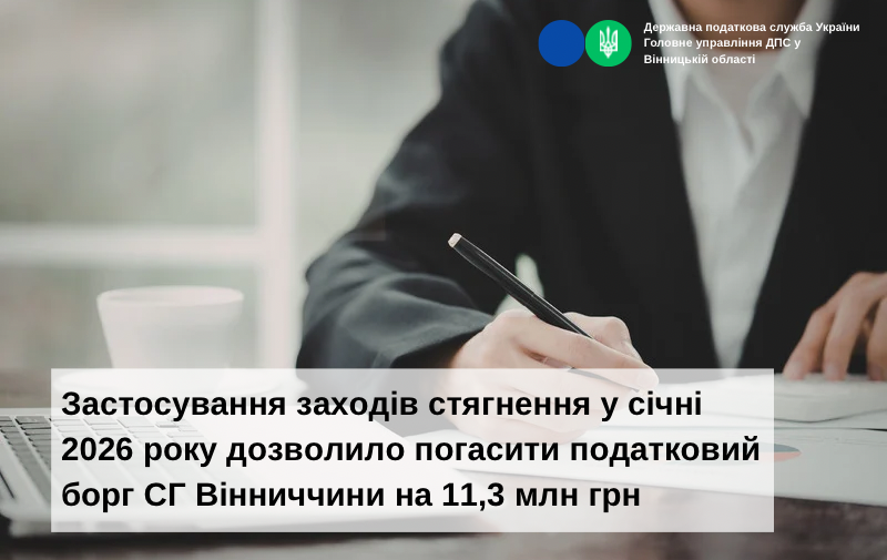 Застосування заходів стягнення у січні 2026 року дозволило погасити податковий борг СГ Вінниччини на 11,3 млн грн
