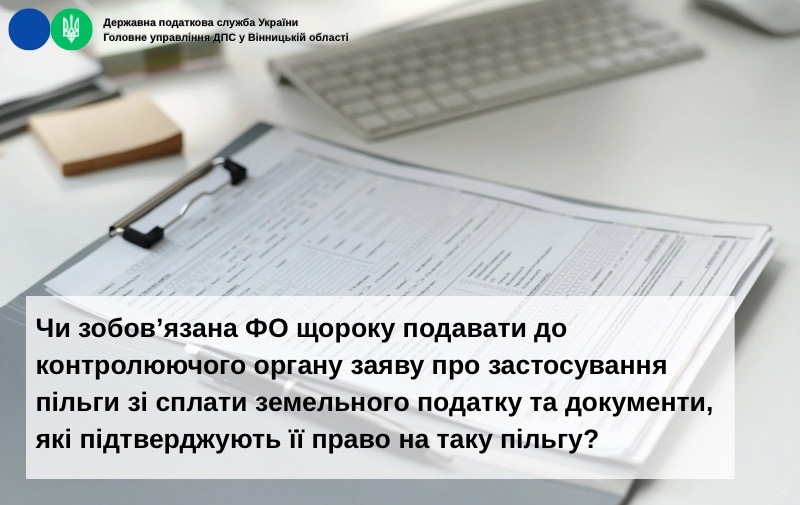 При цьому нормами ПКУ не визначено для фізичної особи обов’язку щорічного подання контролюючому органу заяви про застосування пільги та документів, які підтверджують її право на таку пільгу. Тобто, фізична особа подає до контролюючого органу нову заява про застосування пільги тільки у разі наявності змін у володінні земельними ділянками або зміни земельних ділянок для застосування пільги.