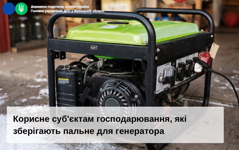 ГУ ДПС у Вінницькій області нагадує, що відповідно до пункту 24 розділу ХІІІ «Перехідні положення» Закону України від 18 червня 2024 року №3817-ІХ «Про державне регулювання виробництва і обігу спирту етилового, спиртових дистилятів, біоетанолу, алкогольних напоїв, тютюнових виробів, тютюнової сировини, рідин, що використовуються в електронних сигаретах, та пального» встановлено, що на період дії воєнного стану в Україні, та протягом 30 днів з дня його припинення або скасування суб’єкт господарювання має право зберігати пальне, яке споживається для заправлення електрогенераторної установки в обсязі до 2000 літрів на кожному об’єкті, що забезпечений електрогенераторною установкою, без отримання дозвільних документів (документів дозвільного характеру, ліцензії на право зберігання пального, результатів надання інших адміністративних послуг).