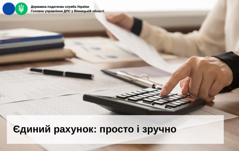 ГУ ДПС у Вінницькій області нагадує, що вiдповiдно до статтi 351 Податкового кодексу України єдиний рахунок - це рахунок, відкритий у центральному органі виконавчої влади, що реалізує державну політику у сфері казначейського обслуговування бюджетних коштів, для центрального органу виконавчої влади, що реалізує державну податкову політику, який може використовуватися платником податків для сплати грошових зобов'язань та/або податкового боргу з податків та зборів, передбачених цим Кодексом, єдиного внеску та інших платежів, контроль за справлянням яких покладено на контролюючі органи.