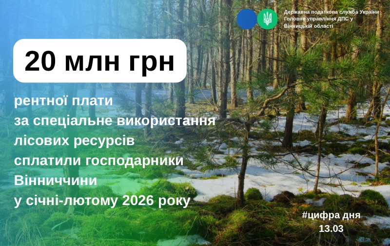 За спеціальне використання лісових ресурсів господарники Вінниччини у січні-лютому 2026 року сплатили 20 млн грн рентної плати.