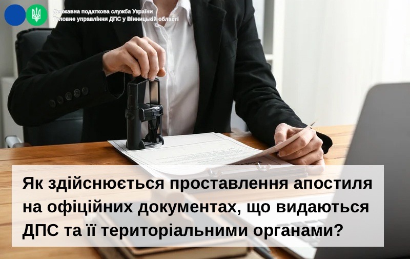 Проставлення апостиля на офіційних документах, що видаються Державною податкової службою України та її територіальними органами, здійснюється ДПС відповідно до Правил проставлення апостиля на офіційних документах, призначених для використання на території інших держав, затверджених наказом Міністерства закордонних справ України, Міністерства внутрішніх справ України, Міністерства освіти і науки України, Міністерства фінансів України, Міністерства юстиції України від 17.03.2023 № 125/209/293/139/999/5. Апостиль проставляється на вимогу особи, яка підписала документ, або на вимогу фізичної/юридичної особи (їх представників). Для проставлення апостиля необхідно подати: