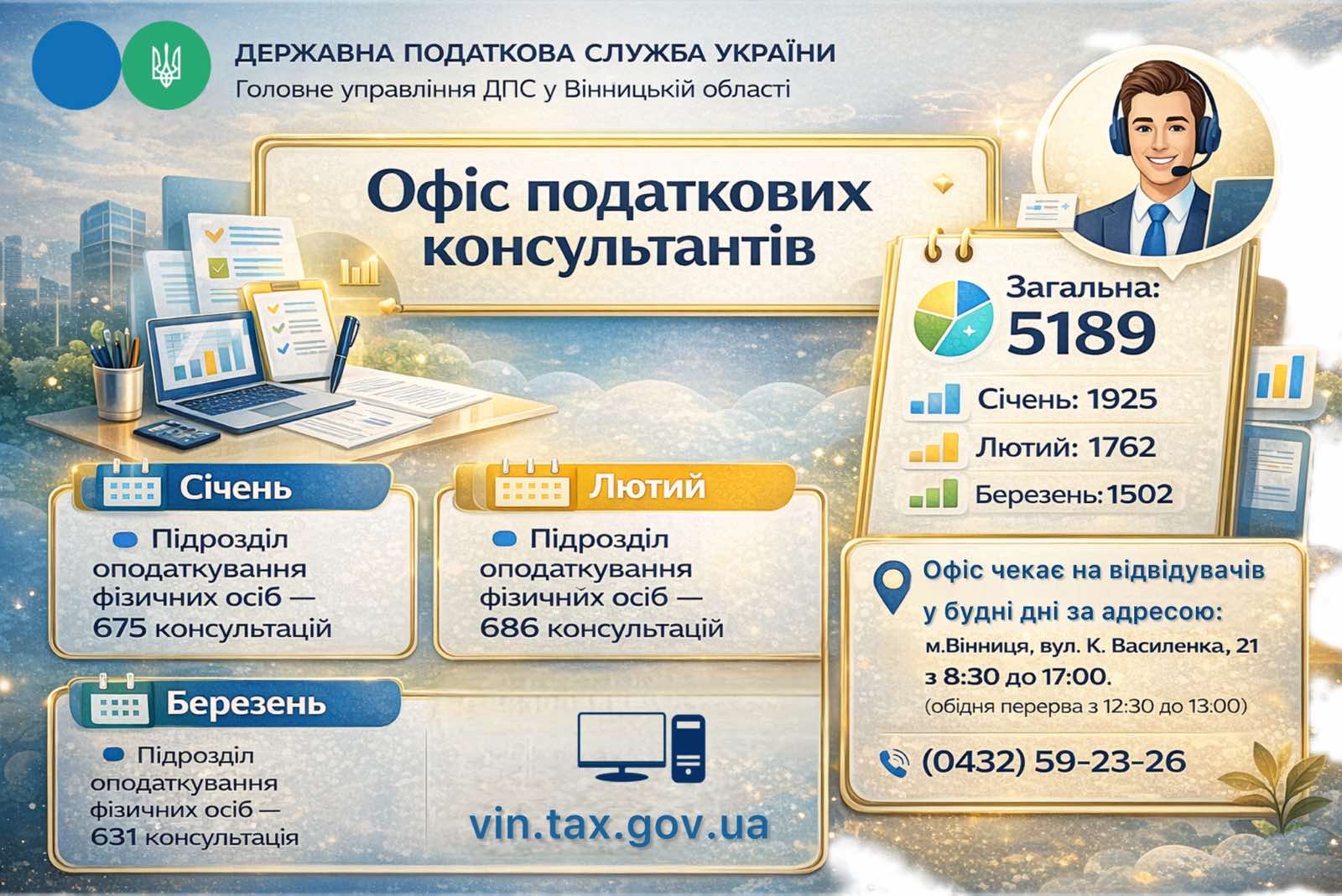 Упродовж січня–березня 2026 року фахівцями Офісу податкових консультантів Головного управління ДПС у Вінницькій області надано 5189 консультацій платникам податків.