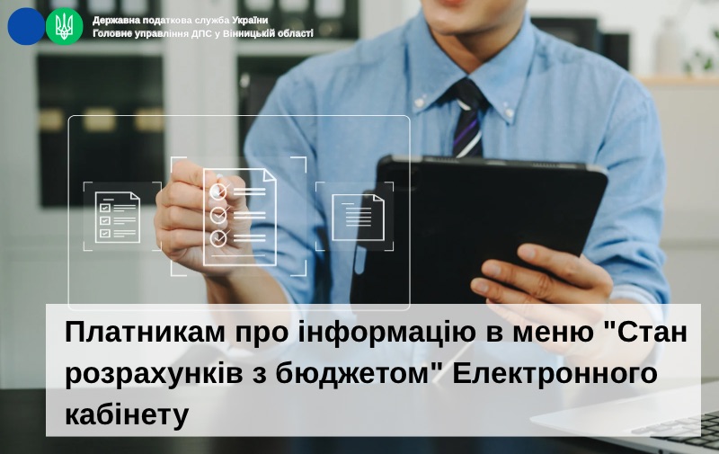 ГУ ДПС у Вінницькій області нагадує, що згідно з абзацом першим пункту 42 прим. 1.2 статті 42 прим. 1 ПКУ Електронний кабінет забезпечує можливість реалізації платниками податків прав та обов'язків, визначених ПКУ та іншими законами, контроль за дотриманням яких покладено на контролюючі органи, та нормативно-правовими актами, прийнятими на підставі та на виконання ПКУ та інших законів, контроль за дотриманням яких покладено на контролюючі органи.