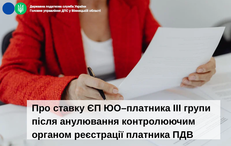 Управління оподаткування юридичних осіб ГУ ДПС у Вінницькій області інформує про те, яку ставку ЄП застосовує ЮО – платник ЄП третьої групи, яка застосовувала ставку ЄП у розмірі 3 відс., після анулювання контролюючим органом реєстрації платника ПДВ в останні дні кварталу, якщо заява про зміну ставки ЄП подається не пізніше ніж за 15 календарних днів до початку наступного календарного кварталу.