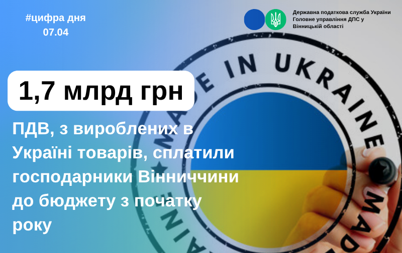 Господарники Вінниччини до бюджету у січні-березні 2026 року сплатили 1,7 млрд грн ПДВ, з вироблених в Україні товарів.