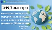 Упродовж січня-вересня 2025 року платники, що здійснюють викиди забруднюючих речовин на Вінниччині, перерахували до бюджетів 249 млн 685,3 тис. грн екологічного податку. Прогнозовані показники виконано на 116,7%. понад план надійшло 345 млн 751,2 тис. грн. Про це повідомила начальник Головного управління ДПС у Вінницькій області Оксана Домерат.