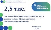 "З початку роботи Офісу податкових консультантів Вінниччини платники регіону отримали майже 2,5 тисячі консультацій", - інформує керівниця Офісу, заступник начальника ГУ ДПС у Вінницькій області Олена Дробенюк, - “Тут кожен, кому потрібна кваліфікована податкова допомога, має можливість отримати від фахівців відповіді на свої запитання”.
