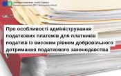 Відділ перевірок фінансових операцій управління податкового аудиту ГУ ДПС у Вінницькій області нагадує, що у підпункті 69.41 пункту 69 підрозділу 10 розділу XX Податкового кодексу України (далі - Кодекс) визначено, що на період дії воєнного стану в Україні, введеного Указом Президента України від 24 лютого 2022 року № 64/2022 «Про введення воєнного стану в Україні» (зі змінами), затвердженим Законом України від 24 лютого 2022 року № 2102-ІХ «Про затвердження Указу Президента України «Про введення воєнного стану в Україні», та по 31 грудня року, в якому воєнний стан припинено або скасовано, для платників податків із високим рівнем добровільного дотримання податкового законодавства встановлюються особливості адміністрування податків, зборів, платежів, які здійснюють контролюючі органи, визначені в підпункті 41.1.1 пункту 41.1 статті 41 у Кодексу.