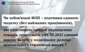 Враховуючи викладене, сплата єдиного внеску за себе фізичними особами – підприємцями (без найманих працівників), які проводять господарську діяльність з продажу підакцизних товарів, здійснюється з 01 жовтня 2025 року без змін – у межах від мінімального страхового внеску до страхового внеску, обчисленого з максимальної величини бази нарахування єдиного внеску.