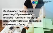Під час заповнення реквізиту «Призначення платежу» платіжної інструкції платники заповнюють такі поля: