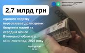 Малий та середній бізнес Вінницької області у січні-листопаді 2025 року перерахував до місцевих бюджетів 2,7 млрд грн єдиного податку.