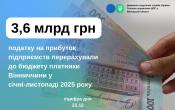 Платники Вінниччини у січні-листопаді 2025 року перерахували до бюджету 3,6 млрд грн податку на прибуток підприємств.