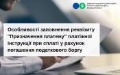 Особливості заповнення реквізиту "Призначення платежу"  платіжної інструкції при сплаті у рахунок погашення податкового боргу
