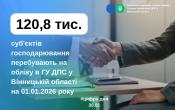 На обліку в ГУ ДПС у Вінницькій області на 01.01.2026 року перебувають 120,8 тис. суб'єктів господарювання.