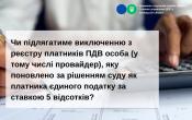 З дати поновлення особи (у тому числі провайдера) як платника єдиного податку за ставкою 5 відс. на підставі рішення суду, яке набрало законної сили, така особа вважатиметься платником єдиного податку. Водночас, особа підлягатиме виключенню з реєстру платників ПДВ.