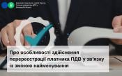 Перереєстрація у зв’язку із зміною найменування (крім перетворення) (прізвища, імені та по батькові) платника ПДВ, який включений до Єдиного державного реєстру юридичних осіб, фізичних осіб-підприємців та громадських формувань, здійснюється контролюючим органом без подання заяви платником ПДВ на підставі відомостей з ЄДР.