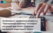 Під час заповнення реквізиту «Призначення платежу» платіжної інструкції платники заповнюють такі поля: