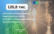 На обліку в ГУ ДПС у Вінницькій області на 01.02.2026 року перебувають 120,8 тис. суб'єктів господарювання.