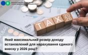 Статтею 32 Закону України від 03 грудня 2025 року № 4695-IX «Про Державний бюджет України на 2026 рік» установлено, що у 2026 році розмір максимальної величини бази нарахування єдиного внесок на загальнообов’язкове державне соціальне страхування (далі – єдиний внесок) – максимальної суми доходу застрахованої особи на місяць, на яку нараховується єдиний внесок, визначеної Законом України від 08 липня 2010 року № 2464-VI «Про збір та облік єдиного внеску на загальнообов’язкове державне соціальне страхування», дорівнює: