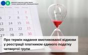 Отже, контролюючий орган за місцем обліку (місцезнаходженням) юридичної особи надає письмову вмотивовану відмову у реєстрації платником єдиного податку четвертої групи та включення до Реєстру платників єдиного податку четвертої групи протягом тридцяти календарних днів, що настають за останнім днем граничного строку подання податкових декларацій з єдиного податку четвертої групи.