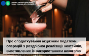 Продаж зазначених коктейлів безпосередньо громадянам та іншим кінцевим споживачам для їх особистого некомерційного використання незалежно від форми розрахунків, у тому числі на розлив у ресторанах, кафе, барах, інших об’єктах громадського харчування, є операціями з реалізації суб’єктами господарювання роздрібної торгівлі підакцизних товарів. Такі операції є об’єктом оподаткування акцизним податком відповідно до п.п. 213.1.9 п. 213.1 ст. 213 ПКУ.