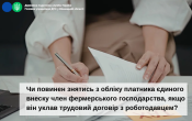 Враховуючи зазначене, якщо член фермерського господарства, який перебуває на обліку як платник єдиного внеску, уклав трудовий договір з роботодавцем, то він повинен подати до контролюючого органу заяву про зняття з обліку платника єдиного внеску за формою № 7-ЄСВ та знятись з обліку у порядку, визначеному розд. V Порядку №1162.