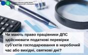 Отже, працівники ДПС мають право здійснювати документальні (планові або позапланові; виїзні) чи фактичні перевірки протягом терміну, який визначений у направленні на перевірку з урахуванням правил внутрішнього трудового розпорядку платника податків.
